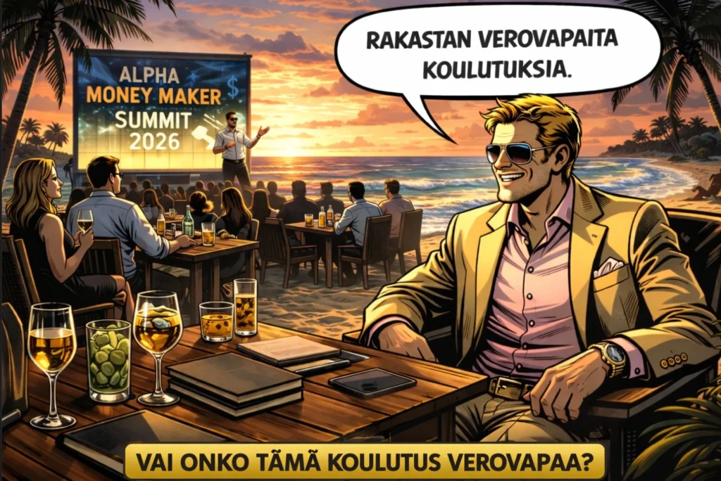 Toinen halpa vakuutus on tilata kirjanpitopalvelut Taloushotellista. Viiden tähden palvelua ei ole meillä se, että sanomme ”kyllä, herra” ja kirjaamme lomasi verovapaaksi koulutukseksi – vaan se, että nakkaamme paratiisisaariretriittisi Alpha Money Maker 2026 -tapahtumasta samaan laariin kuin verotarkastajakin – ja selitämme sitten, missä voit oikeasti säästää veroissa.